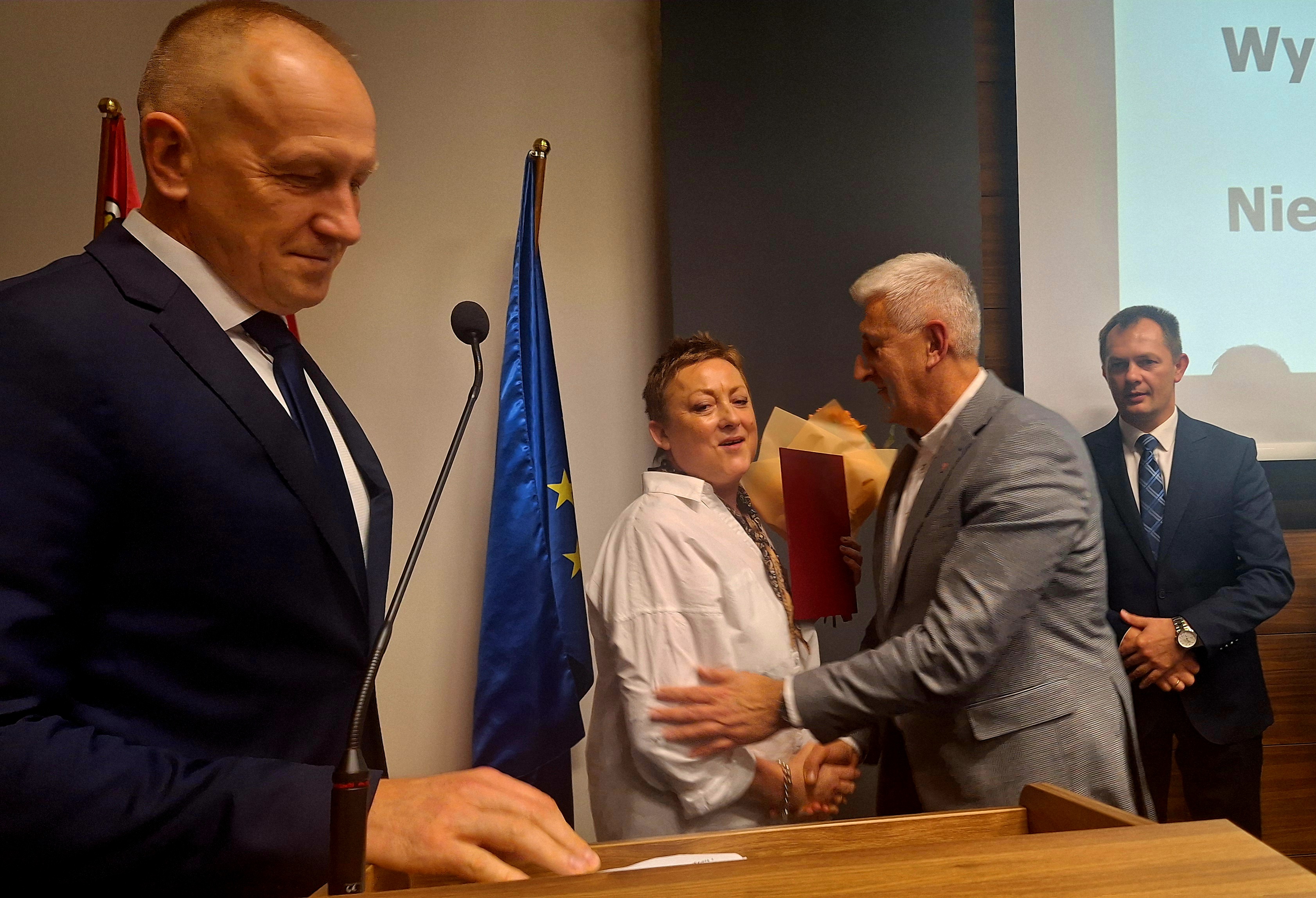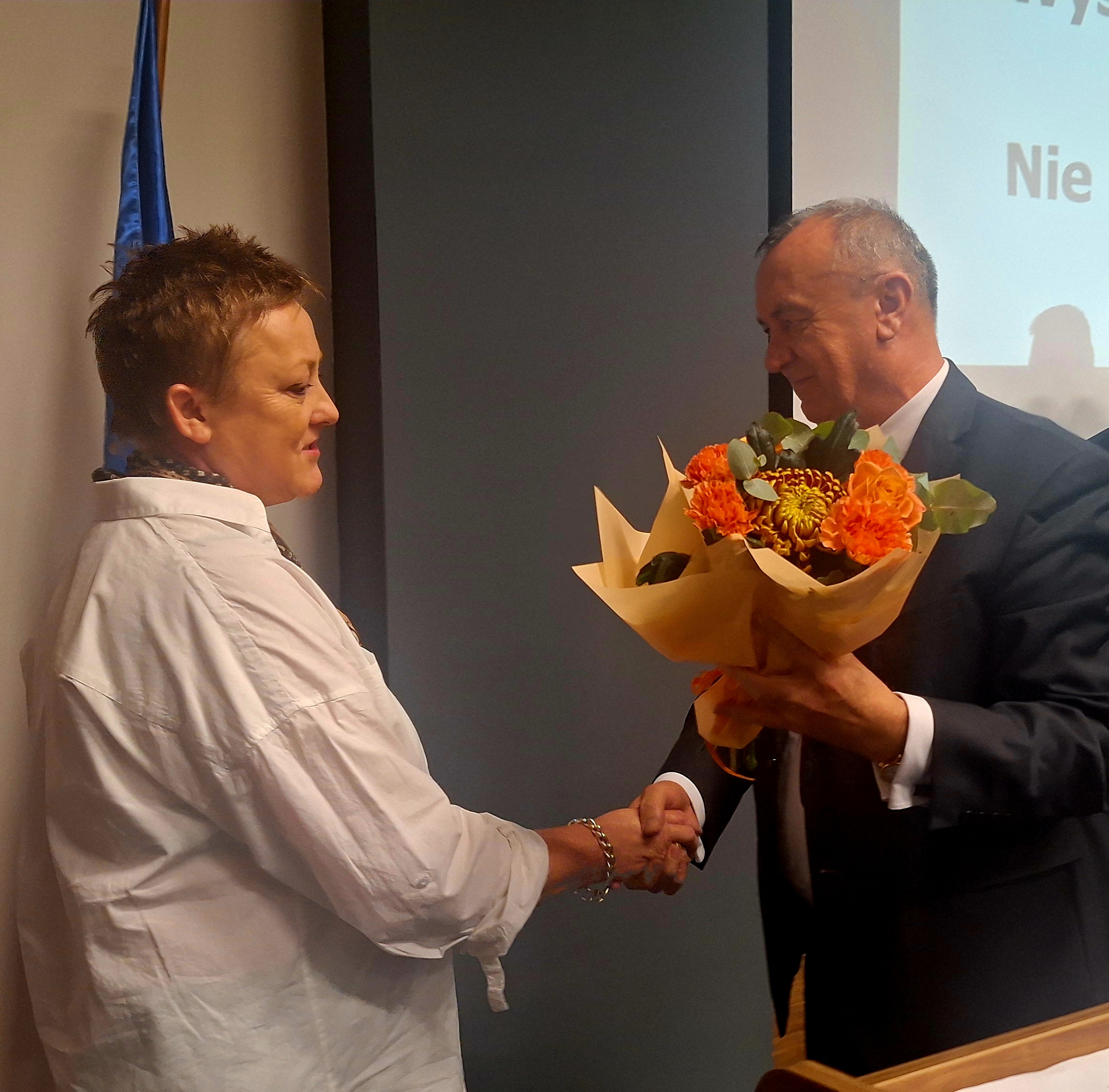 Po wręczeniu Pani Elżbiecie bukietu przez Przewodniczącego Rady Powiatu Kolskiego Ryszard Kasiorek, wyrazy szacunku za pracę na rzecz dzieci po przez uścisk dłoni wyrazili Wicestarosta Kolski Lech Brzeziński i Wiceprzewodniczący Marek Świątek i Łukasz Królasik.