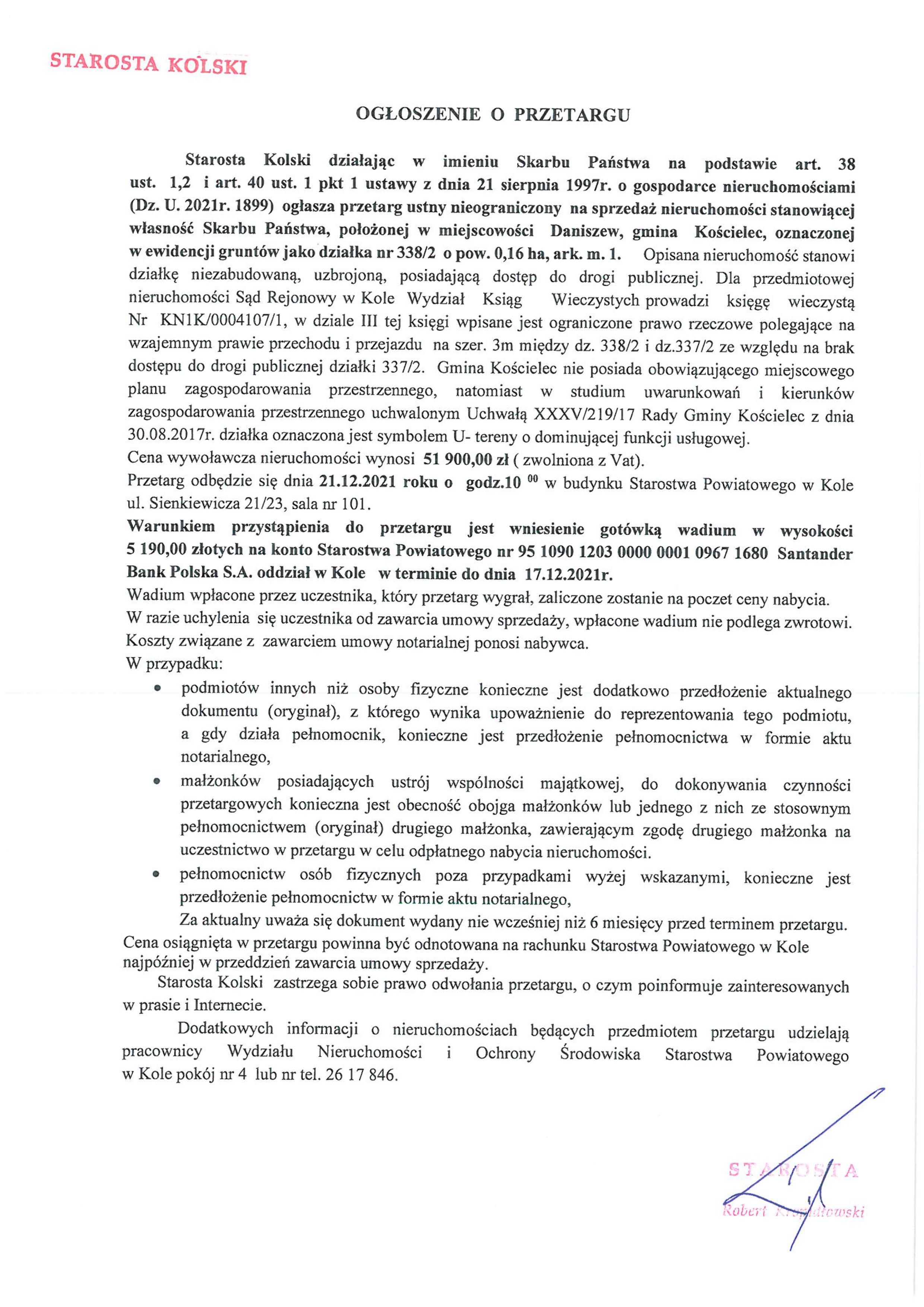 Starosta Kolski działając w imieniu Skarbu Państwa na podstawie art. 38 ust. 1,2 i art. 40 ust. 1 pkt 1 ustawy z dnia 21 sierpnia 1997 r. o gospodarce nieruchomościami (Dz.U.2021 r. 1899) ogłasza przetarg ustny nieograniczony na sprzedaż nieruchomości stanowiącej własność Skarbu Państwa, położonej w miejscowości Daniszew, gmina Kościelec, oznaczonej w ewidencji gruntów jako działka nr 3382/2 o pow. 0,16 ha, ark.m.1.