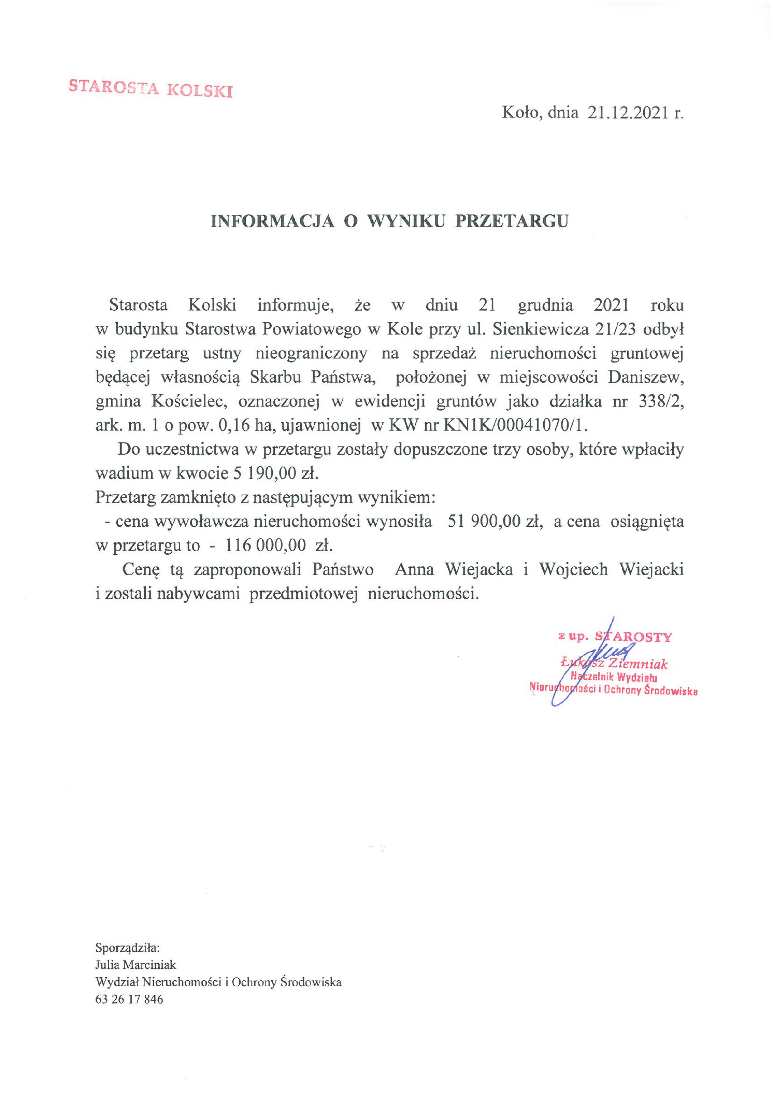 Starosta Kolski informuje, że w dniu 21 grudnia 2021 roku w budynku Starostwa Powiatowego w Kole przy ul. Sienkiewicza 21/23 odbył się przetarg ustny nieograniczony na sprzedaż nieruchomości gruntowej będącej własnością Skarbu Państwa, położonej w miejscowości Daniszew, gmina Kościelec, oznaczonej w ewidencji gruntów jako działka nr 338/2, ark. m. 1 o pow. 0,16 ha, ujawnionej w KW nr KN1K/00041070/1.