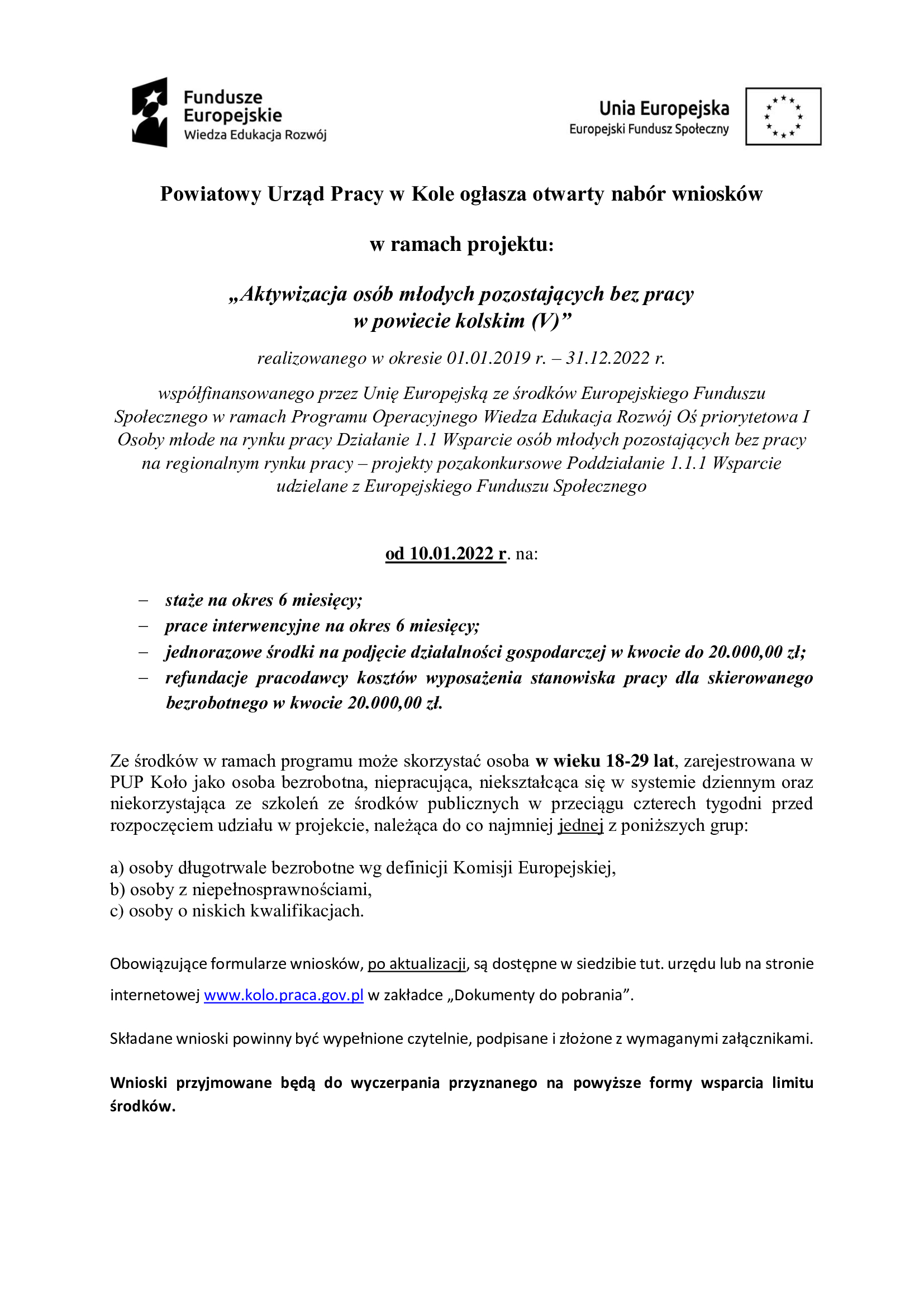 Powiatowy Urząd Pracy w Kole ogłasza otwarty nabór wniosków w ramach projektu: „Aktywizacja osób młodych pozostających bez pracy w powiecie kolskim (V)”