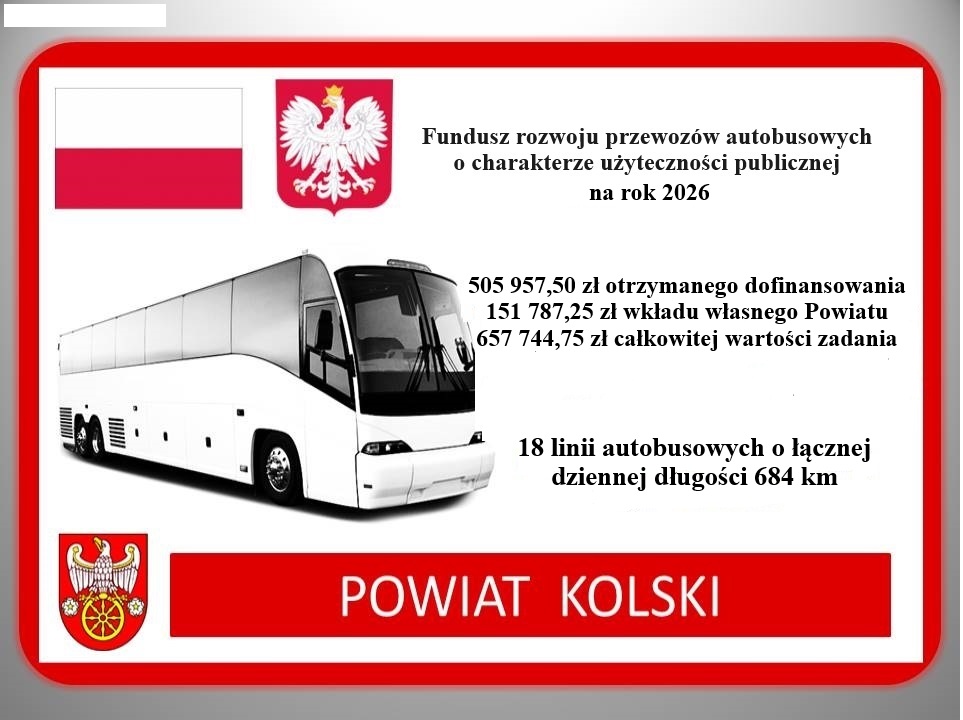 Na podstawie zawartej w dniu 11.02.2026r. umowy z Wojewodą Wielkopolskim powiat kolski zrealizuje w 2026r. zadanie organizacji publicznego transportu zbiorowego o charakterze użyteczności publicznej w obrębie swoich granic administracyjnych, które zostało dofinansowane ze środków Funduszu Rozwoju Przewozów Autobusowych.